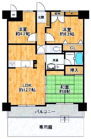 / LDK / 12.7畳×1室 / 洋 / 6.2畳×1室 / 洋 / 4.2畳×1室 / 和 / 6畳×1室