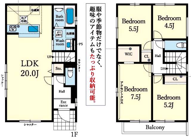 1F / LDK / 20畳×1室2F / 洋 / 7.5畳×1室2F / 洋 / 5.5畳×1室2F / 洋 / 5.2畳×1室2F / 洋 / 4.5畳×1室